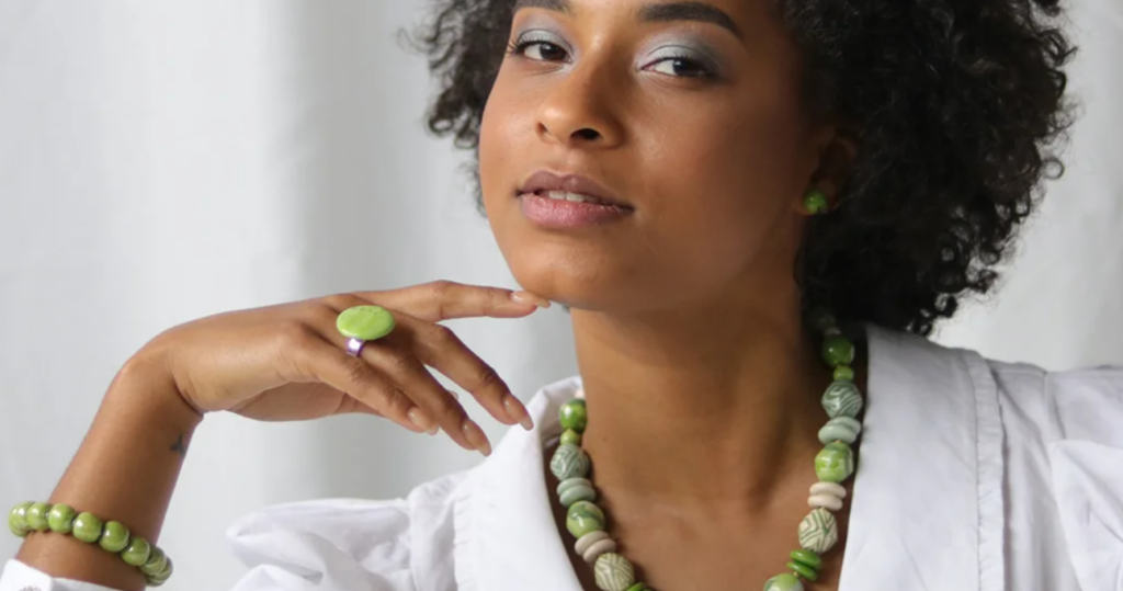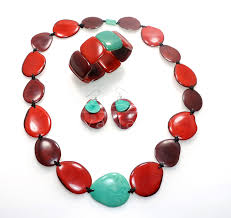 De sieraden van Nayá Nayón zijn gemaakt van de taguanoot, een noot van de Taguapalm. Na het drogen wordt deze hard en wit, net als ivoor. Daarna worden de taguakralen gekleurd met textielverf. Weliswaar chemische kleurstoffen, maar niet giftig.